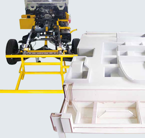徹底した低重心設計により驚異の最大安定傾斜角度実測38度(計算値42度)を実現しました。ホイールベースを205mm延長することで、高い走行安定性を確保し、さらにヨコハマモーターセールスの特許製品である『FRP一体成型セミモノコックフロアーユニット』の採用により、トータル的な軽量化を実現しました。