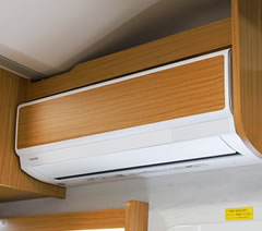 暑い夏も、寒い冬も、快適な室内温度を提供するエアコンはキッチン上部に設置。家具と同色のデカールで一体感を演出しています。