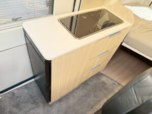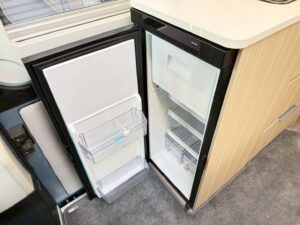 → 車内で完結できる水回り。シンク+2口ガスコンロ+大容量80L冷蔵庫