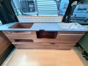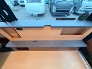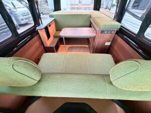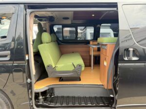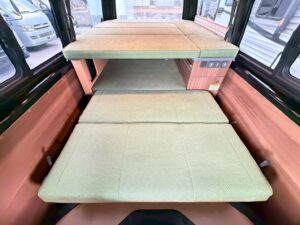 ダイネットベッド: 280cm × 120cm コンパクトな車体ながら、2段ベッド構造により最大5名の就寝が可能です。
